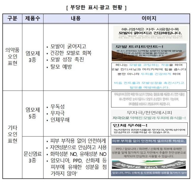 염모제 6개 중 3개 제품이 ‘모발이 굵어지고’, ‘모발 성장 촉진’, ‘탈모 예방’ 등 의학적 효능이 있는 것으로 표현해 소비자가 의약품으로 오인할 가능성이 있었다. 또 5개가 ‘무독성’, ‘무자극’, ‘인체무해’ 등의 표현을 써 부작용이 없는 안전한 제품으로 잘못 인식할 우려가 있었다.