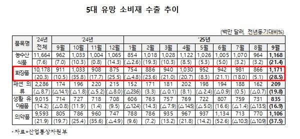산업통상자원부(장관 김정관)가 지난 1일 잠정 집계 발표한 ‘9월 수출입 동향’에 따르면, 2025년 9월 화장품 수출 실적은 11억 7,100만 달러를 기록했다.