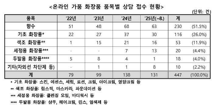 품목별 상담 건수는 향수가 51.5%(230건)로 가장 많았고, 다음으로 기초 화장품 26.0%(116건), 색조 화장품 11.9%(53건), 세정용 화장품 4.4%(20건) 등의 순이었다. 이중 기초 화장품과 색조 화장품은 최근 3년간 상담 건수가 계속 증가했다.