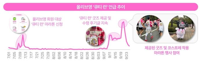 올리브영 ‘큐티 런’은 참여자 신청에서부터 마라톤 참여, 굿즈 인증까지 시작부터 끝까지 화제가 됐다. 올리브영 큐티 런은 산리오 콜라보 이벤트로 기획돼 지난 7월부터 참여자 신청을 받았다. 9월 중순부터 마라톤 키트를 미리 발송해 9월 20일 행사 당일에 티셔츠, 양말, 가방 착용 인증 글이 활발히 공유됐다.