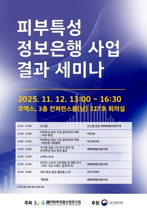 [CMN 심재영 기자] (재)대한화장품산업연구원(원장 조신행)은 오는 11월 12일(수) 오후 1시부터 4시 30분까지 코엑스 3층 컨퍼런스룸(남) 317호에서 ‘피부특성 정보은행 사업 결과 세미나’를 개최한다고 밝혔다.