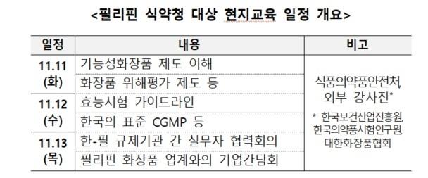 이번 교육은 지난 4월 식약처와 필리핀 식약청 간 화장품 분야 규제협력 및 교류를 강화하기 위해 체결했던 양해각서(MOU)의 후속 조치인 동시에 아시아 국가 대상 공적개발원조(ODA) 사업의 일환이다.