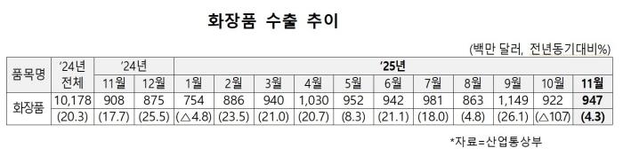 산업통상부(장관 김정관)가 오늘(1일) 발표한 ‘2025년 11월 수출입 동향’에 따르면, 11월 화장품 수출은 9.5억 달러를 기록, 전년 동월 대비 4.3% 증가했다.