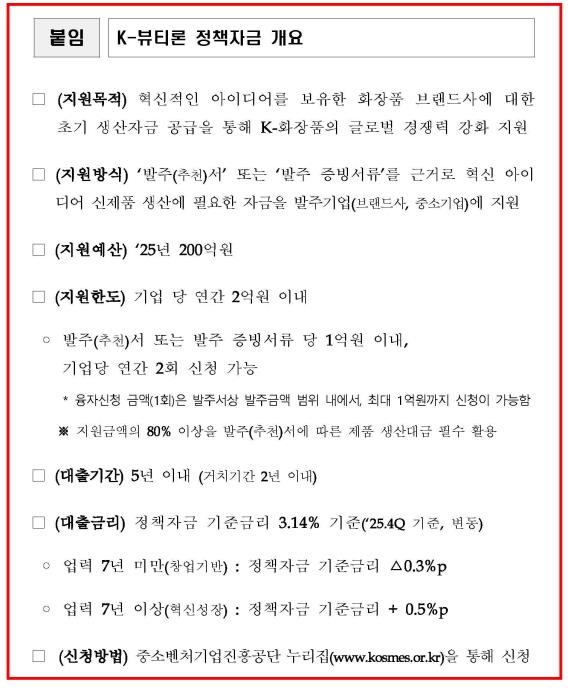 중기부에 따르면, 올해 K-뷰티론 지원 예산은 200억 원이다. 지원 한도는 기업 당 연간 2억 원 이내로, 발주(추천)서 또는 발주 증빙서류 당 1억 원 이내, 기업당 연간 2회 신청이 가능하다. 단, 융자신청 금액(1회)은 발주서상 발주 금액 범위 내에서 최대 1억 원까지 신청이 가능하며, 지원 금액의 80% 이상을 발주(추천)서에 따른 제품 생산대금에 반드시 활용해야 한다.