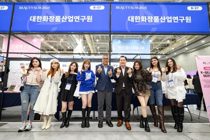 2025 뷰티썸 수원 대한화장품산업연구원 부스 앞에서 이재준 수원시장(왼쪽에서 여섯번째)과 조신행 대한화장품산업연구원장(왼쪽에서 다섯번째) [사진제공=수원시]