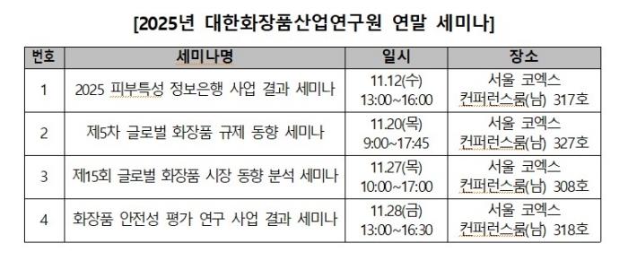 [CMN 심재영 기자] (재)대한화장품산업연구원(원장 조신행)은 11월 중 올 한 해 동안 진행한 해외 시장 및 산업 정보 사업의 결과를 공유하는 분야별 세미나를 잇따라 4차례 개최한다고 밝혔다.