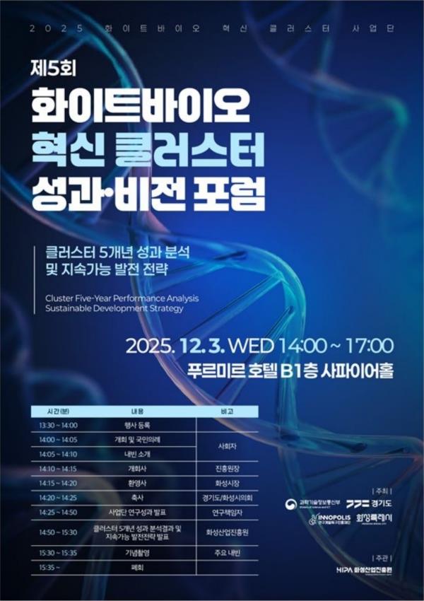 [CMN 심재영 기자] (재)화성산업진흥원은 오는 12월 3일(수) 오후 2시부터 4시까지 경기도 화성시 소재 푸르미르호텔 사파이어홀 B1층에서 ‘2025년 제5회 화이트바이오 혁신 클러스터 성과‧비전 포럼’을 개최한다고 밝혔다.